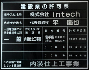 お客様に安心と高品質な施工をご提供するため、内装仕上工事業の建設許可番号を取得